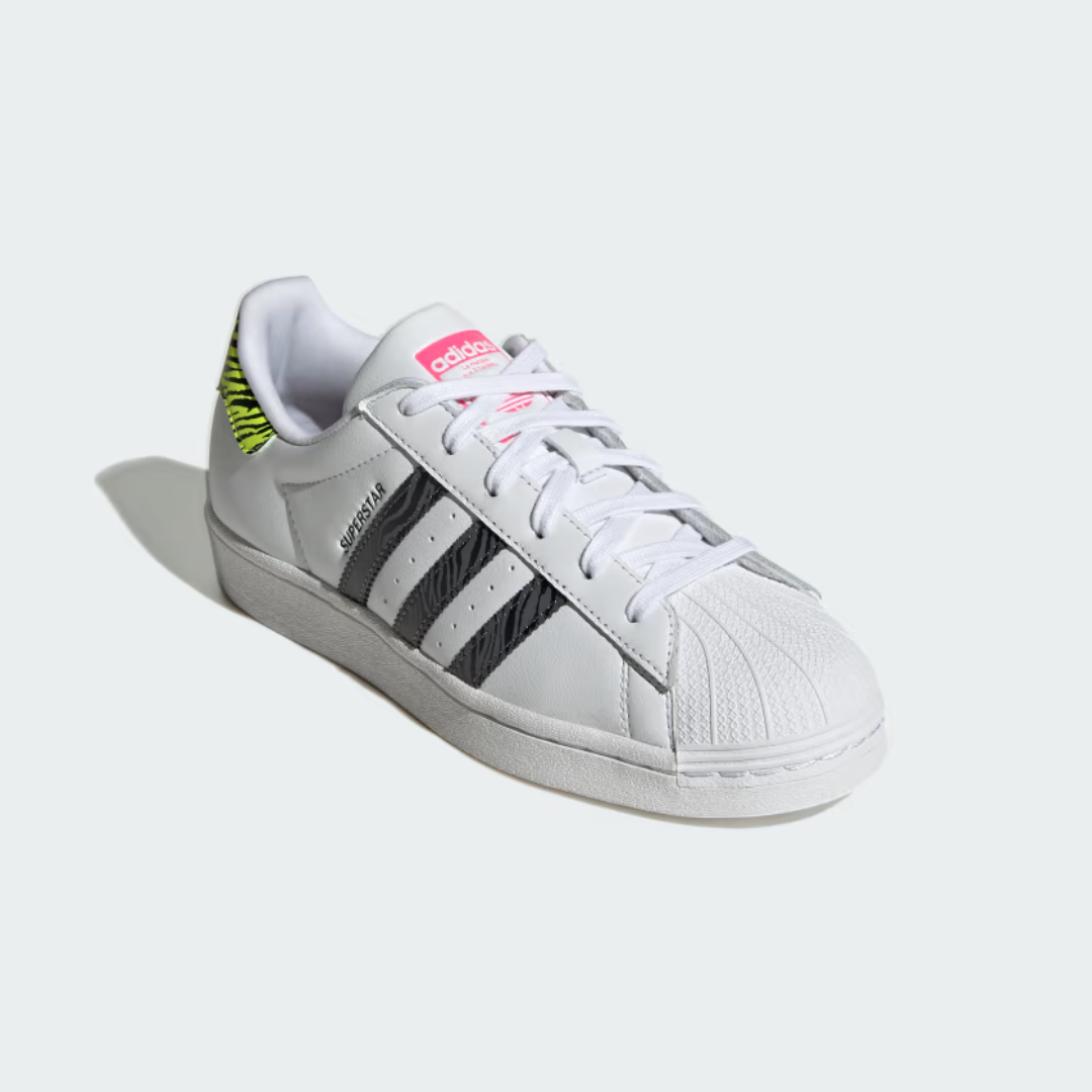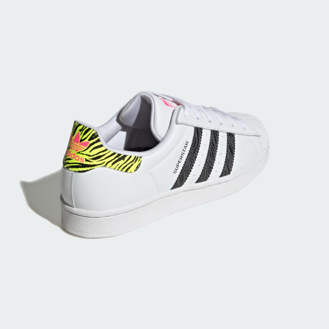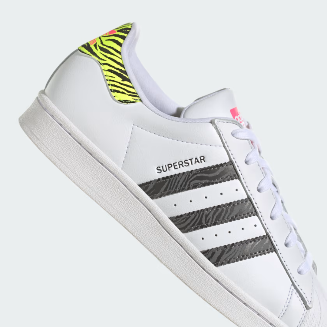 Always identifiable by their iconic rubber shell toe, adidas Superstar shoes have become a staple of everyday wear. This dynamic edition puts a playful twist on the OG design. Animal prints run wild across the synthetic upper and dynamic heel tab. Zebra stripes even sneak inside the shoe, running down their cushy sockliners. A translucent Trefoil lace detail adds a final sporty touch to this bold and trendy style. Made with a series of recycled materials, this upper features at least 50% recycled content. This product represents just one of our solutions to help end plastic waste.